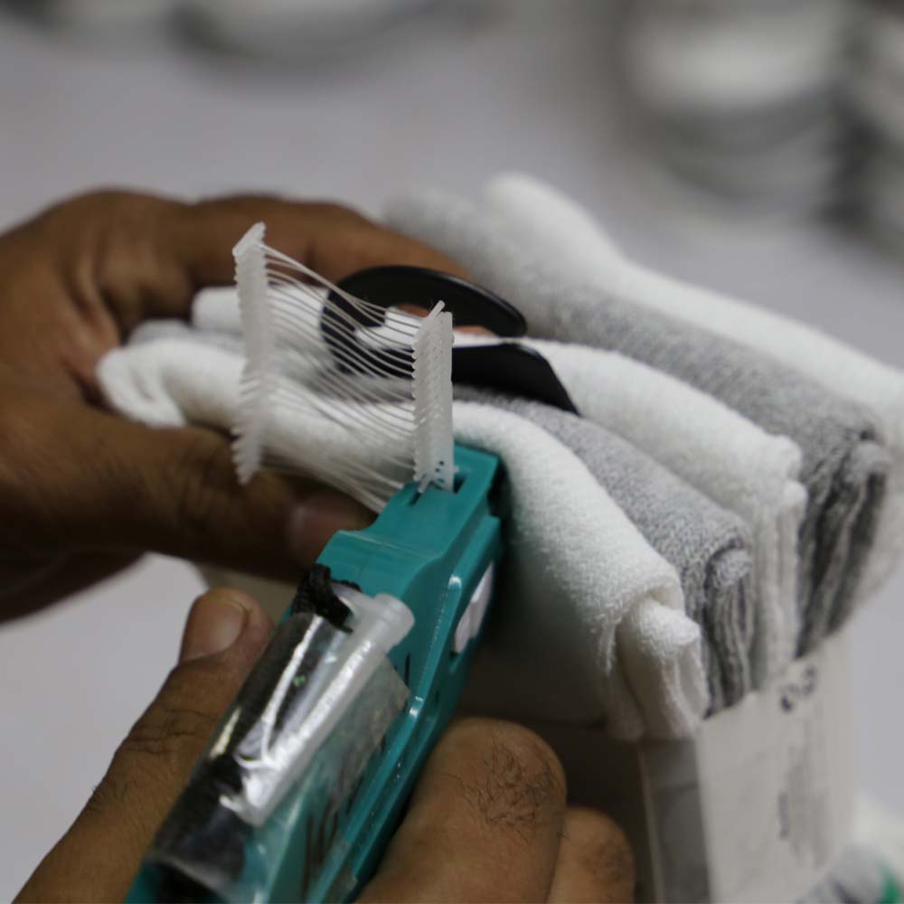 Keystone has a large number of electrical boarding machines. Capable of giving long life and wrinkle-free appearance to the socks. Here socks are pulled on the flat metal surface to achieve the desired form and they are steamed to finish shaping.